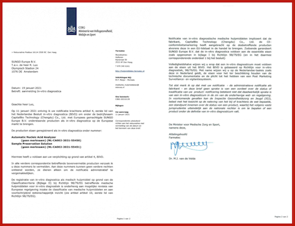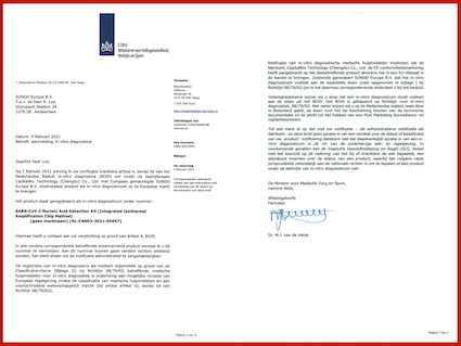 ? ? ? 近日,博奧晶典聯合清華大學成功研發的由新型冠狀病毒2019-nCoV核酸檢測試劑盒(全集成碟式芯片法),英文名稱:SARS-CoV-2 Nucleic Acid Detection Kit (Integrated Isothermal Amplification Chip Method)和全自動核酸分析儀,英文名稱:Automatic Nucleic Acid Analyzer組成的全集成芯片實驗室系統獲CE準入資質(證書號:NL-CA002-2021-55957和NL-CA002-2021-55450),獲CE準入資質表明該產品符合歐盟醫療器械相關指令的符合性要求,具備歐盟市場的準入條件,將為歐洲地區的新冠疫情防控工作提供高靈敏度全集成快速檢測工具。