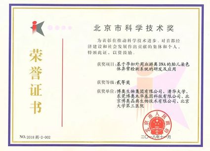 另外,與本產(chǎn)品相關(guān)的“基于孕婦外周血游離DNA的胎兒染色體異常檢測(cè)系統(tǒng)的研發(fā)及應(yīng)用”榮獲2018年度北京市科學(xué)技術(shù)獎(jiǎng)二等獎(jiǎng)。
