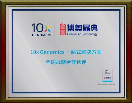 2021年6月28日,北京博奧晶典生物技術(shù)有限公司(以下簡(jiǎn)稱“博奧晶典”)與10x Genomics公司“一站式解決方案全球戰(zhàn)略合作伙伴”簽約授牌儀式在京舉行。10x Genomics公司中國(guó)區(qū)總經(jīng)理江滔,中國(guó)北方區(qū)銷售經(jīng)理付大超,仁科生物科技集團(tuán)有限公司執(zhí)行總裁邱雁南,博奧晶典副總裁兼科研合作服務(wù)中心主任孫義民、副主任李彥澤、產(chǎn)品總監(jiān)孟晨、銷售總監(jiān)龐博等出席簽約授牌儀式。