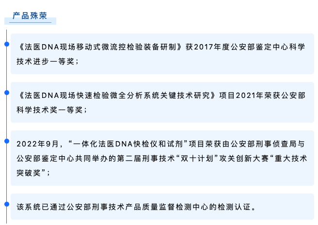 博奧晶典Quick TargSeq全集成自動化現場快速DNA檢測系統是由公安部鑒定中心聯合清華大學、博奧生物集團、北京博奧晶典生物技術有限公司共同開發的國內第一款具有完全自主知識產權的全集成自動化現場快速DNA檢測系統。該系統采用模塊化微流控芯片技術,將樣本前處理、多重 PCR 擴增和毛細管電泳全過程集成于一體,實現 2 小時“樣本進-結果出”的法醫 DNA 現場快速檢測,可在野外、車載等非實驗室環境下運行,為我國公安機關現場犯罪偵破、海關出入境檢查、重大公共安全事件的快速處置增添強勁利器。目前,博奧晶典DNA快檢系統已遠銷俄羅斯、岡比亞等國,以先進的技術裝備支持刑事科學技術邁向新臺階。