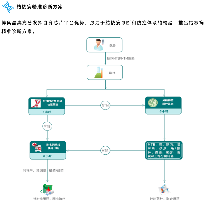 結(jié)核病精準(zhǔn)診斷方案中包含:分枝桿菌核酸檢測(cè)試劑盒(PCR-熒光探針法)、分枝桿菌菌種鑒定試劑盒(DNA微陣列芯片法)、結(jié)核分枝桿菌耐藥基因檢測(cè)試劑盒(DNA微陣列芯片法)。這三款診斷產(chǎn)品,環(huán)環(huán)相扣,涵蓋了結(jié)核快速篩查、菌種鑒定、耐多藥結(jié)核病快速診斷,構(gòu)成了晶芯®結(jié)核病快速分子診斷系統(tǒng)。結(jié)核診斷、輔助用藥全面覆蓋,真正實(shí)現(xiàn)結(jié)核全程分子監(jiān)控。